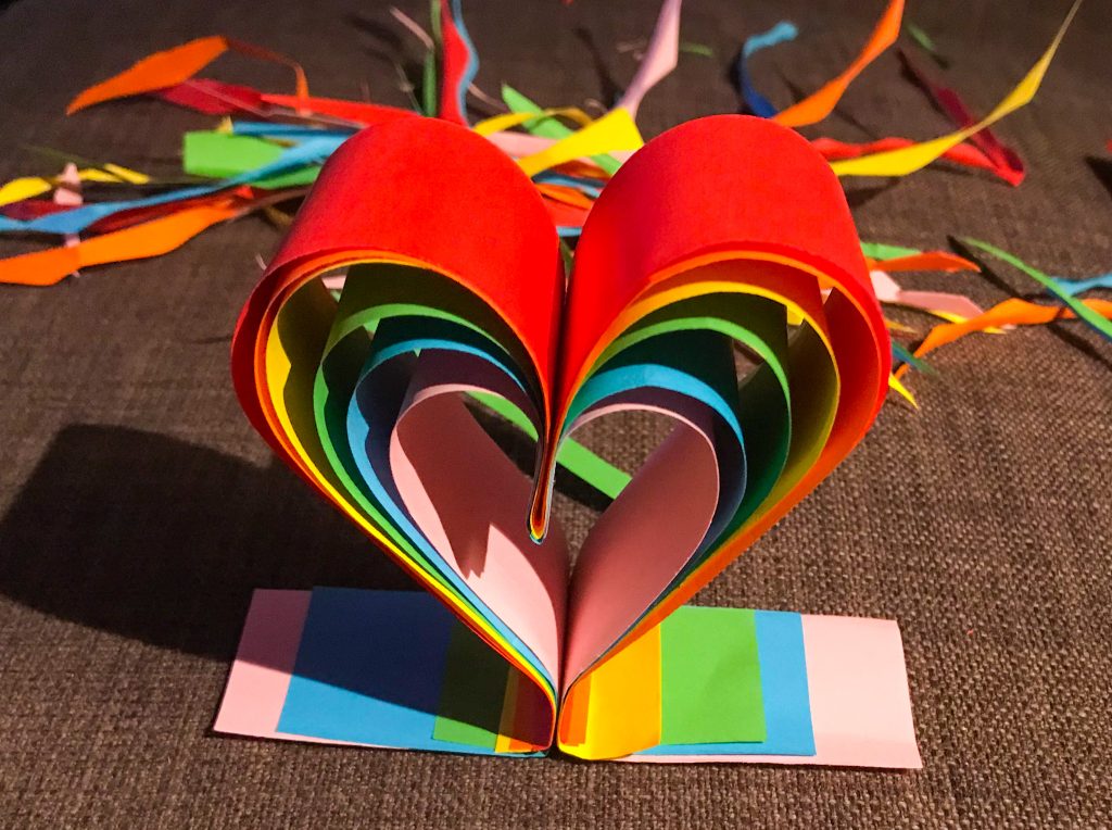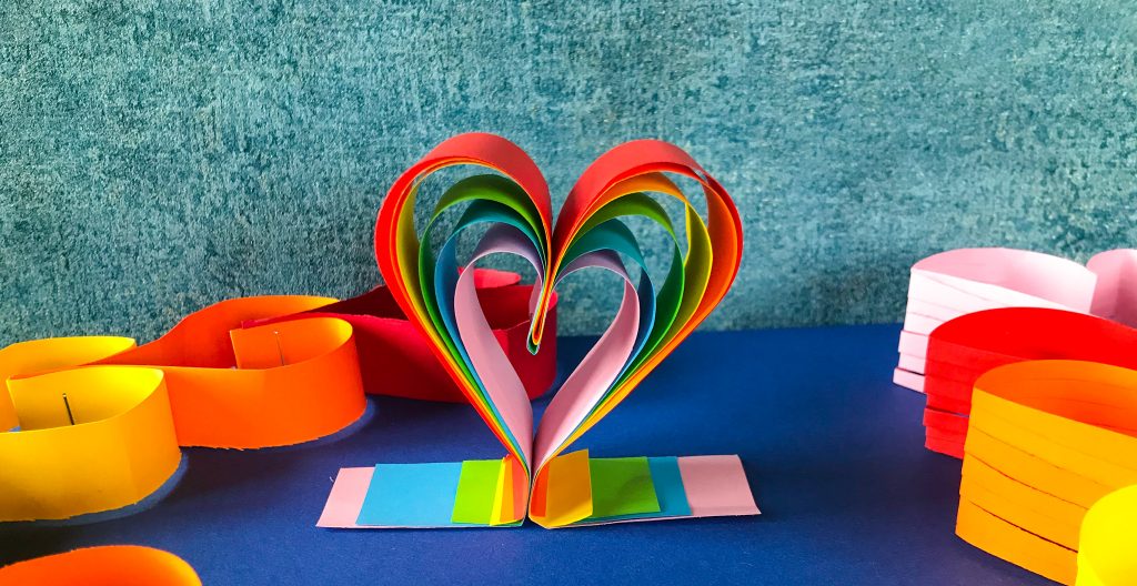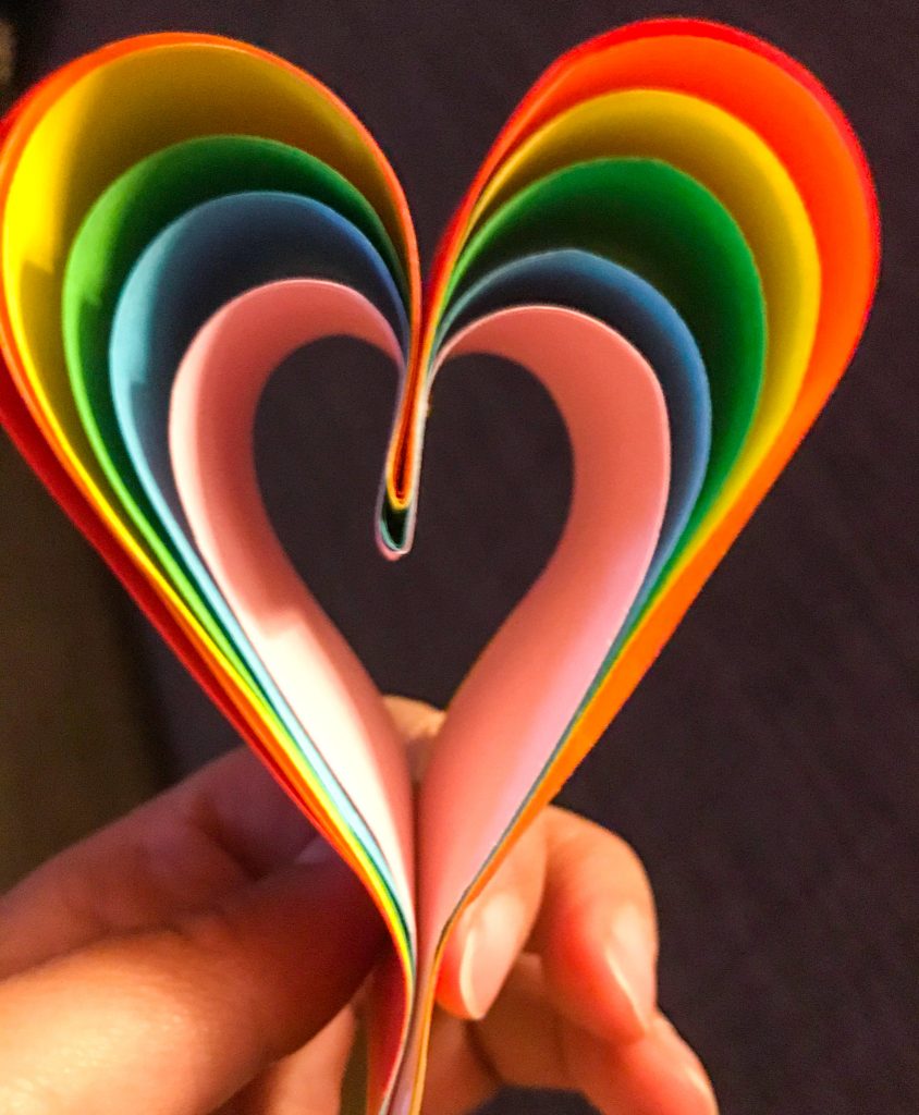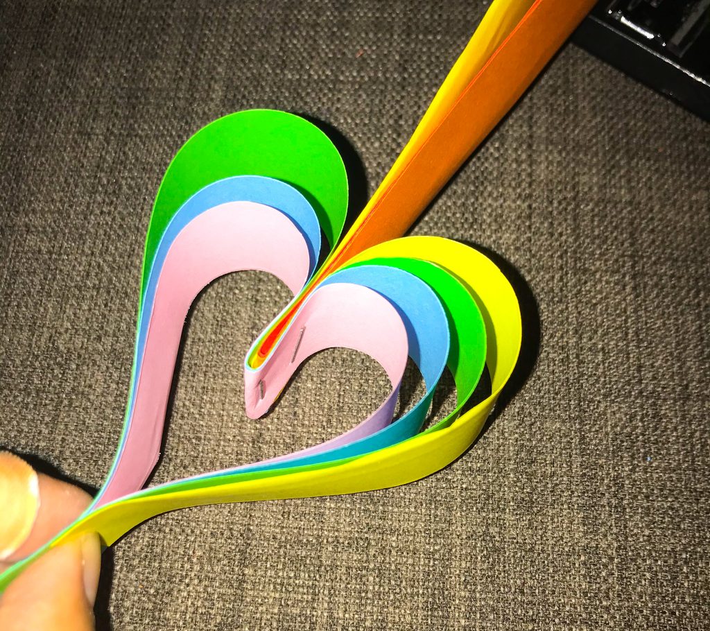 Während man die einzelnen Streifen zusammenführt, ist es wichtig, dass man hier mit den Abständen variiert, so dass ein gestuftes Herz entsteht, bzw. man auch alle Farben sieht. Würde man nur alle Streifen gleichzeitig umlegen und nicht die Abstände der Streifen verändern, würde man die einzelnen Farben nicht sehen und auch diesen fächerartigen Effekt nicht erlangen.