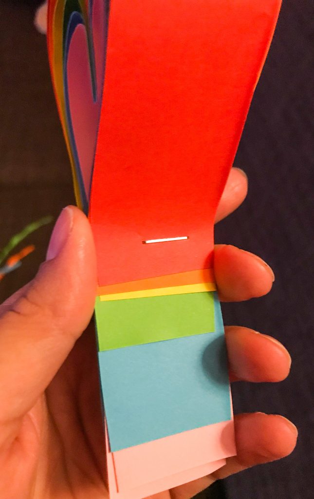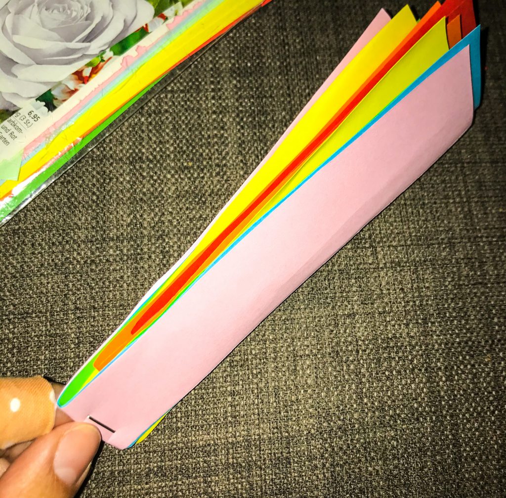 Papierstreifen in Regenbogenfarben zuschneiden. Dann die Streifen in der Mitte knicken. Hier den Knick mit einer Tackernadel fixieren.