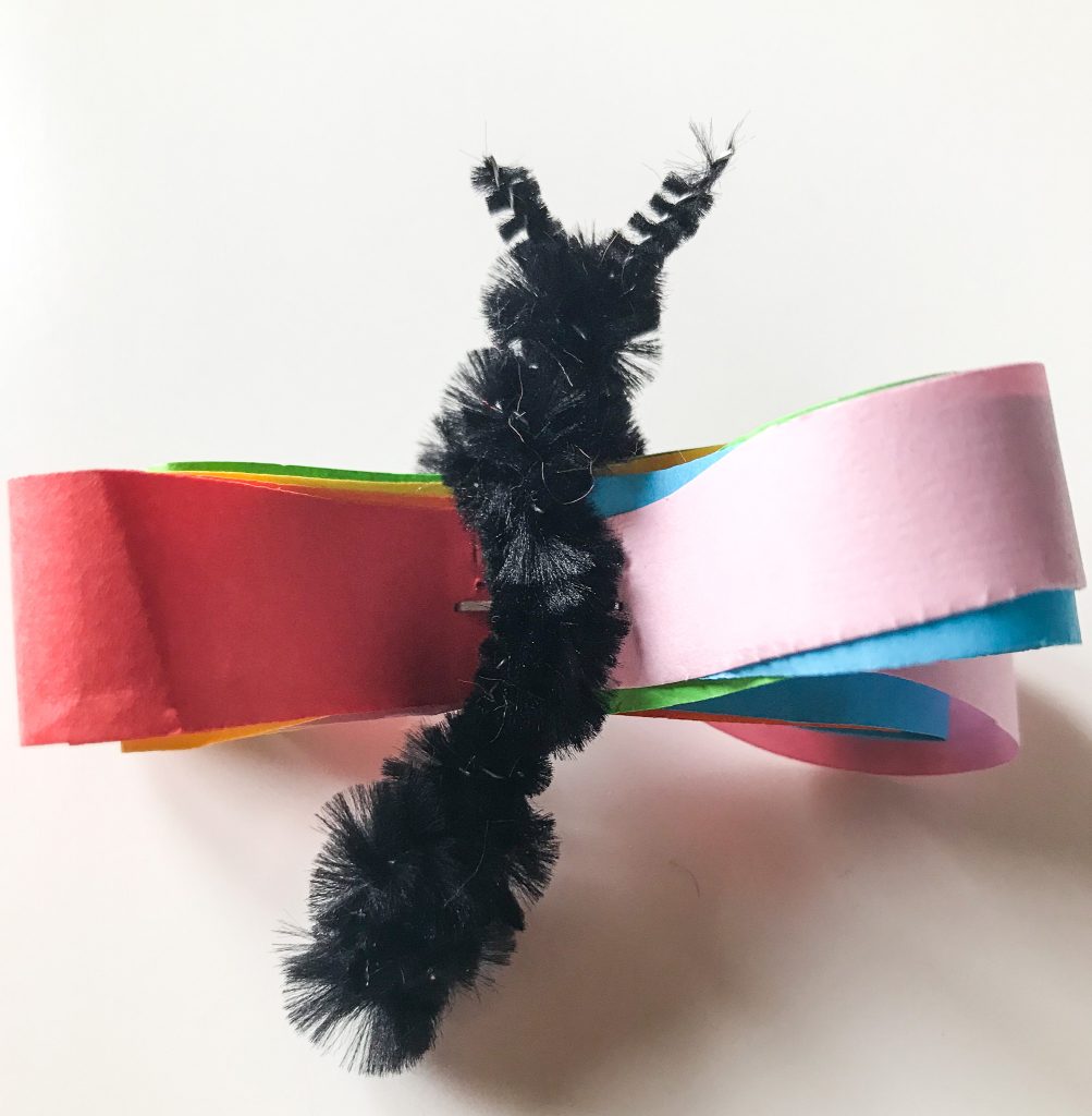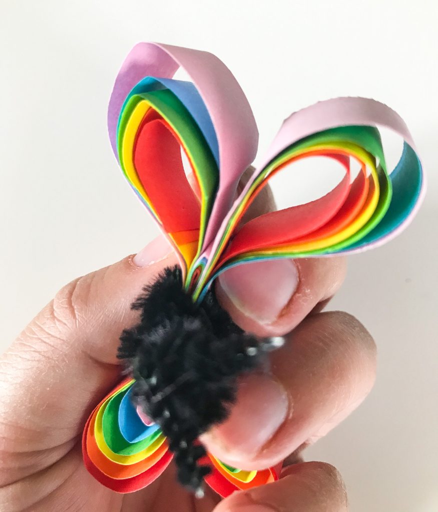 An dieser Stelle kommt der Pfeifenreiniger zum Einsatz. In der so entstandenen Mitte zwischen den zwei Herzen bindet man einem schwarzen Pfeifenreiniger um das Papier als Körper des Schmetterlings. Indem man hinten eine Schlaufe macht und den dann nach vorne geht, wird der Körper schön bauschig. Wenn man dann vorne angekommen ist, den Pfeifenreiniger so abschneiden, dass der erste Fühler entsteht. Dann nimmt man einen weiteren Pfeifenreiniger und stellt den Kopf und den zweiten Fühler her, indem man alles an den Korpus wickelt – das funktioniert durch den Draht ziemlich gut.