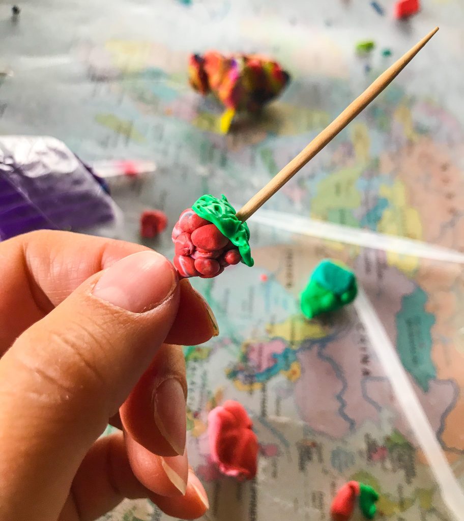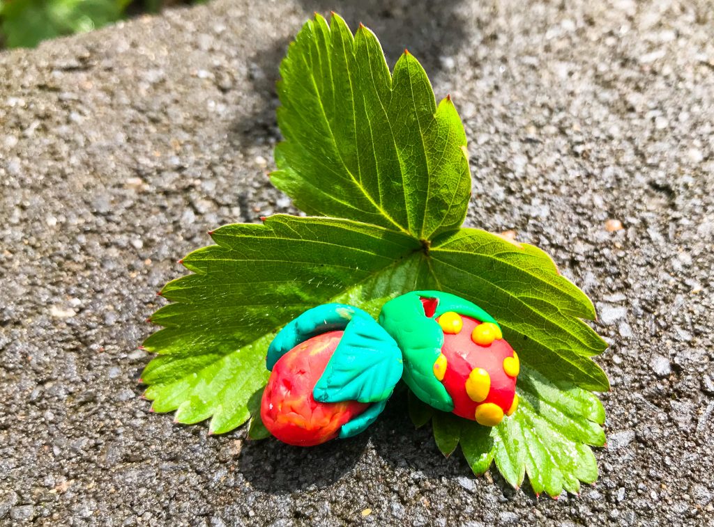 Für die Erdbeere formt man eine Form, die ungefähr einer Herzform entspricht. Nun hat man zwei Möglichkeiten. Entweder man piekst mit dem Zahnstocher kleinere Löcher in die Beere oder man formt die kleinen Samen aus gelbem Ton und bringt sie außen auf. Dann verfährt man wie oben bei den Himbeeren und formt die Blätter.