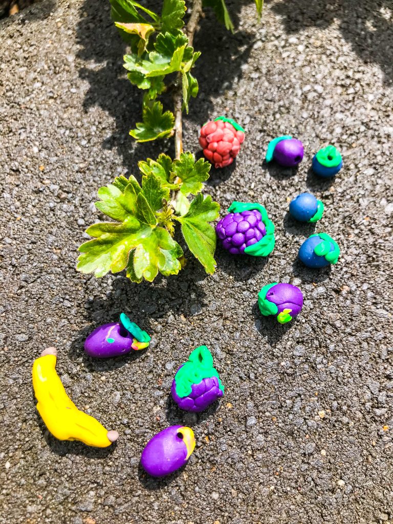 Gerade die Blaubeeren und Erdbeeren sind für kleine Kinder schon recht gut umsetzbar. Bei den Himbeeren und Brombeeren werden die kleinen Kügelchen auch schon einmal zu sehr zerdrückt. Aber auch die Banana aus Ton (siehe Bild).