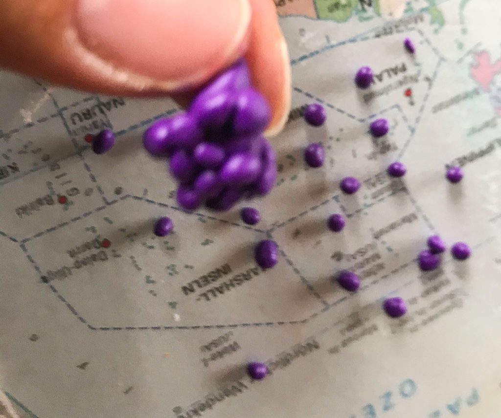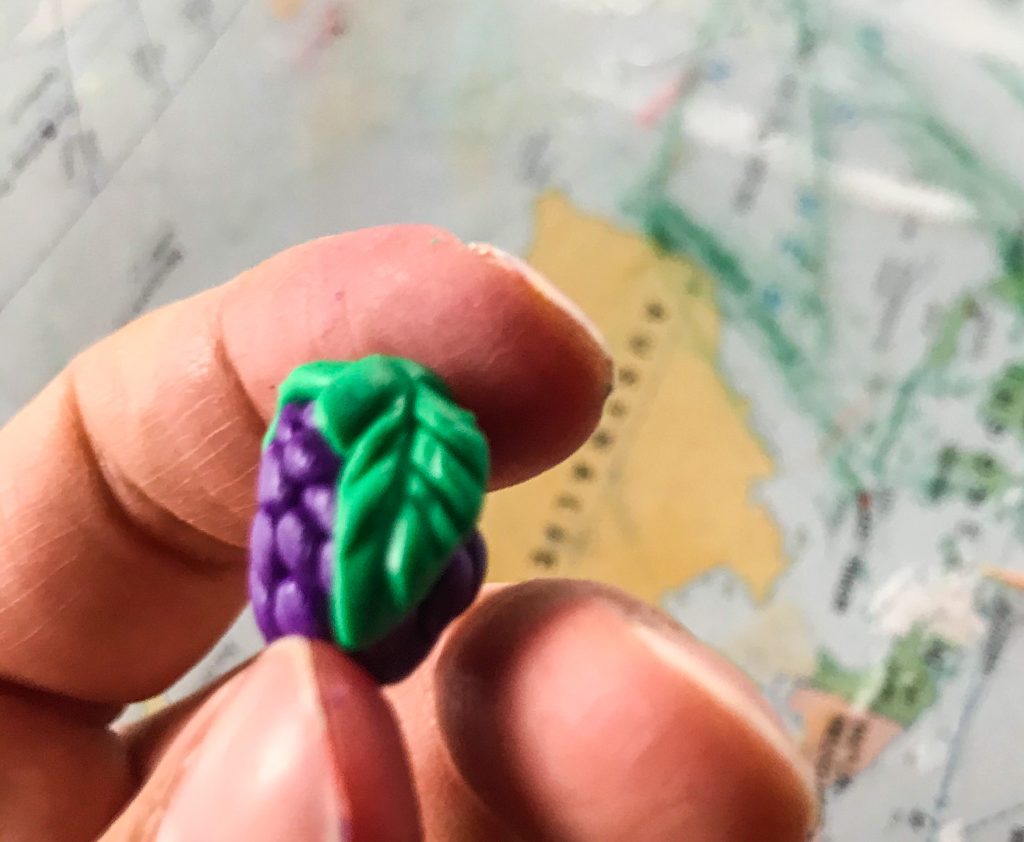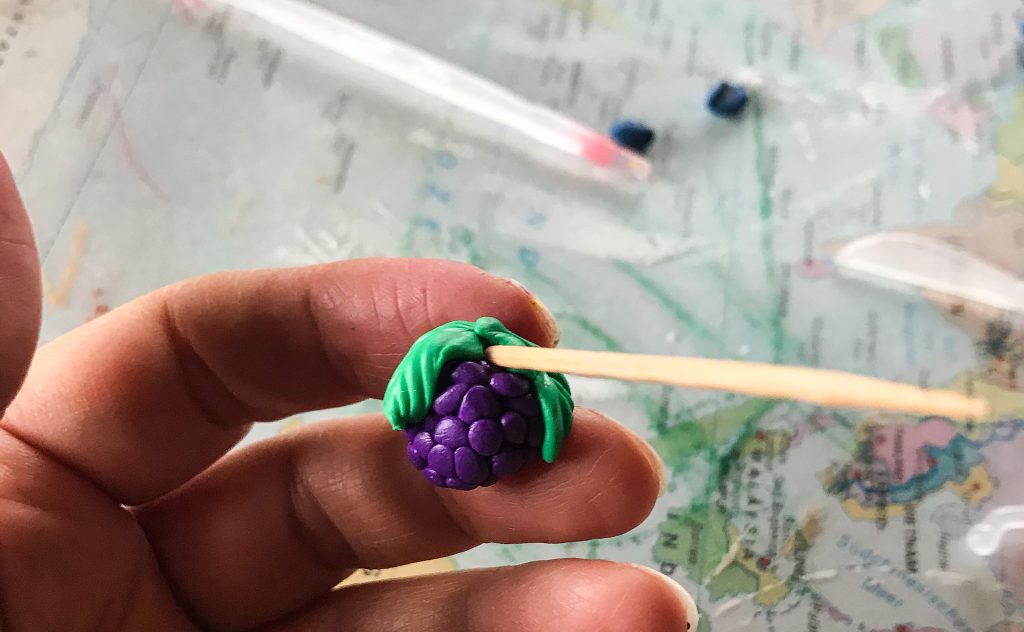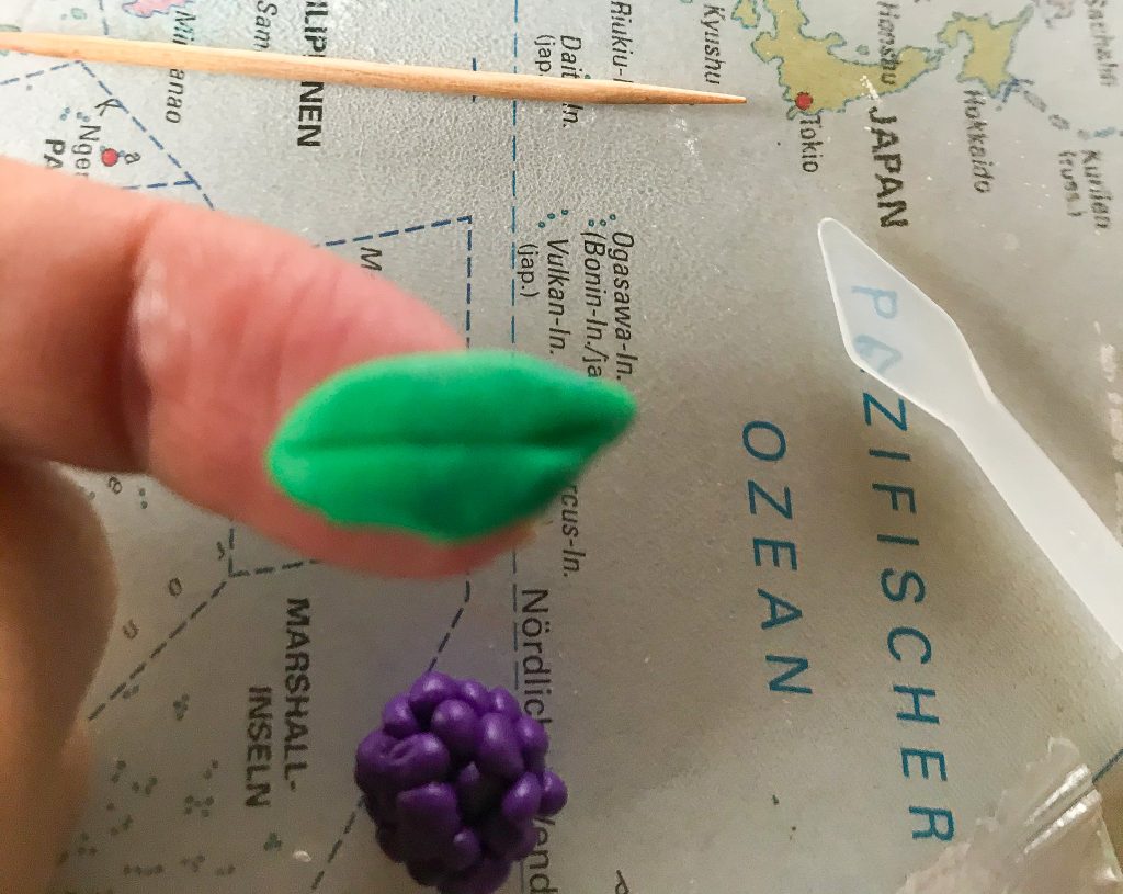 Wenn die Blätter und die Früchte/Beeren fertig sind, kann man beides zusammenbringen und dann mithilfe eines Zahnstochers oder Holzspießes das gewünschte Loch durchstechen, sofern man aus der Frucht eine Perle machen möchte.