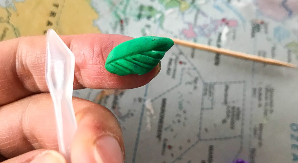 Für die Blätter formt man ein spitzzulaufendes Oval (also eine Blattform). Danach kann man mit einem Modellierwerkzeug oder einem Zahnstocher die Blattadern und den Blattrand herausarbeiten.