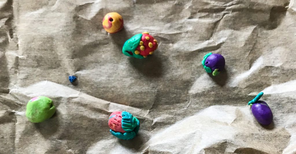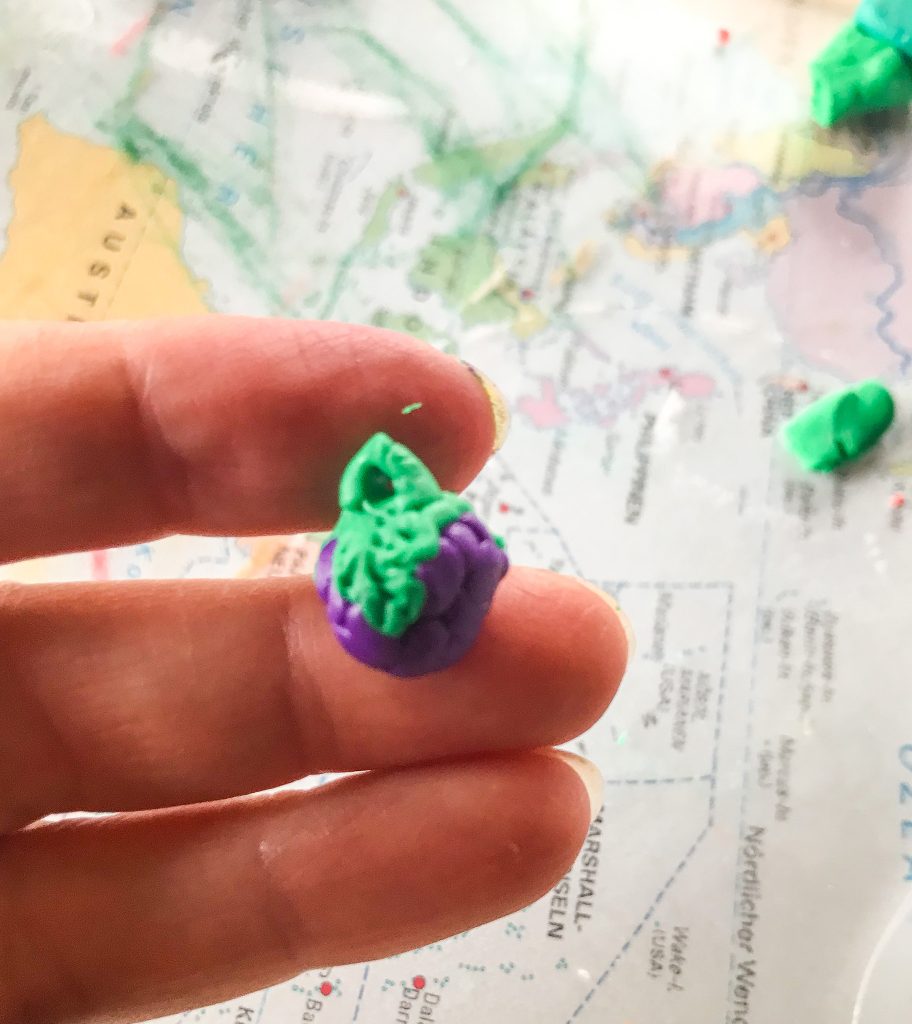 Für die Himbeeren und Brombeeren viele kleine Kugeln formen. Dann rollt man eine etwas größere Kugel in der Handfläche, in derselben Farbe wie die kleinen Kugeln. Dann drückt man die kleineren Kugeln an die größere. Wenn die Beere fertig ist, bringt man die Blätter an.