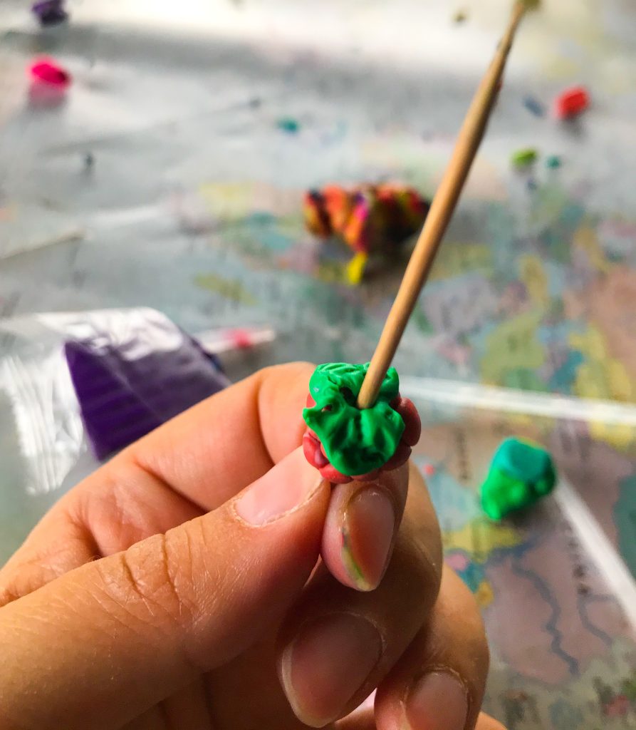 Man formt einfach eine Kugel und etwas Grün für den oberen Teil (siehe Bild). Danach bringt man alles zusammen und für eine Perle nimmt man wieder einen Zahnstocher für das Loch.