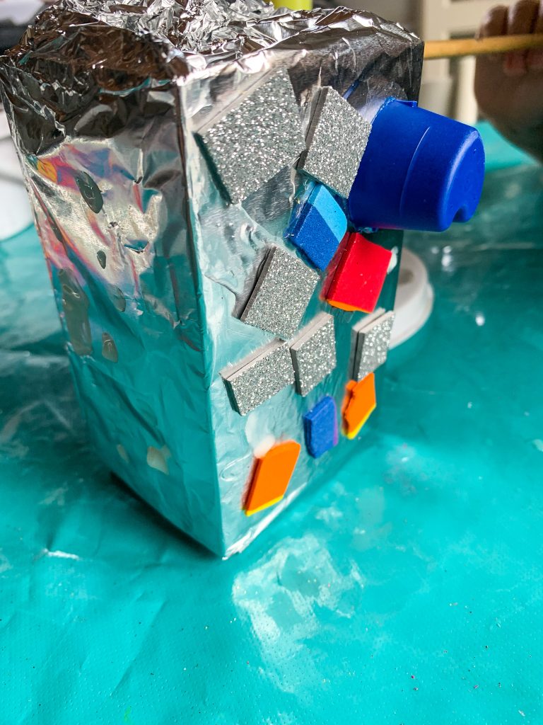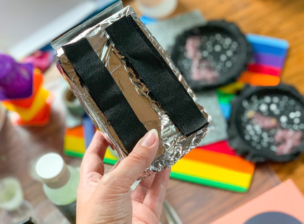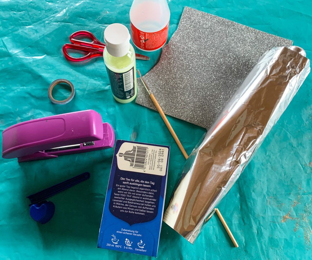 Zunächst die Schachtel mit Kleber bestreichen und dann mit Alufolie verkleiden. Danach das Moosgummi in Quadrate schneiden und vom Dosierlöffel den Griff entfernen.