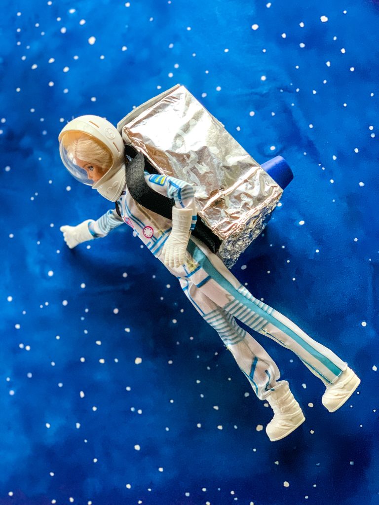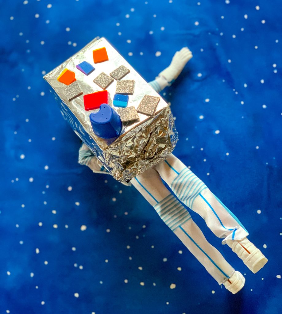 Eine Schachtel, die zur Raumfahrerpuppe passt (wie eine Teepackung)