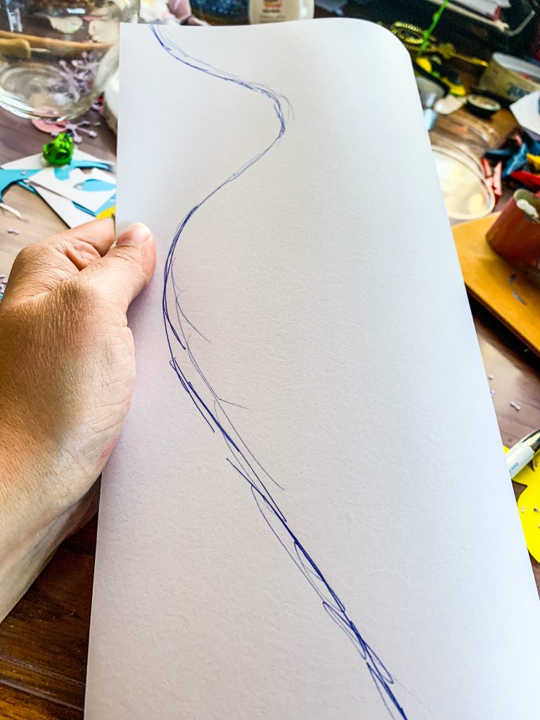 Dann auf einer Seite die Form der Vase aufzeichnen und so ausschneiden, dass automatisch auf beiden Seiten eine symmetrische Vase entsteht. (Man könnte aber auch vorher eine Schablone zeichnen und ausschneiden und diese dann auf die Rückseite der Vase aufzeichnen. Bei der Schablone wäre ein Knick in der Mitte irrelevant.). Die so entstandene Vase nochmals auf den zweiten Bogen zeichnen und ebenfalls ausschneiden.