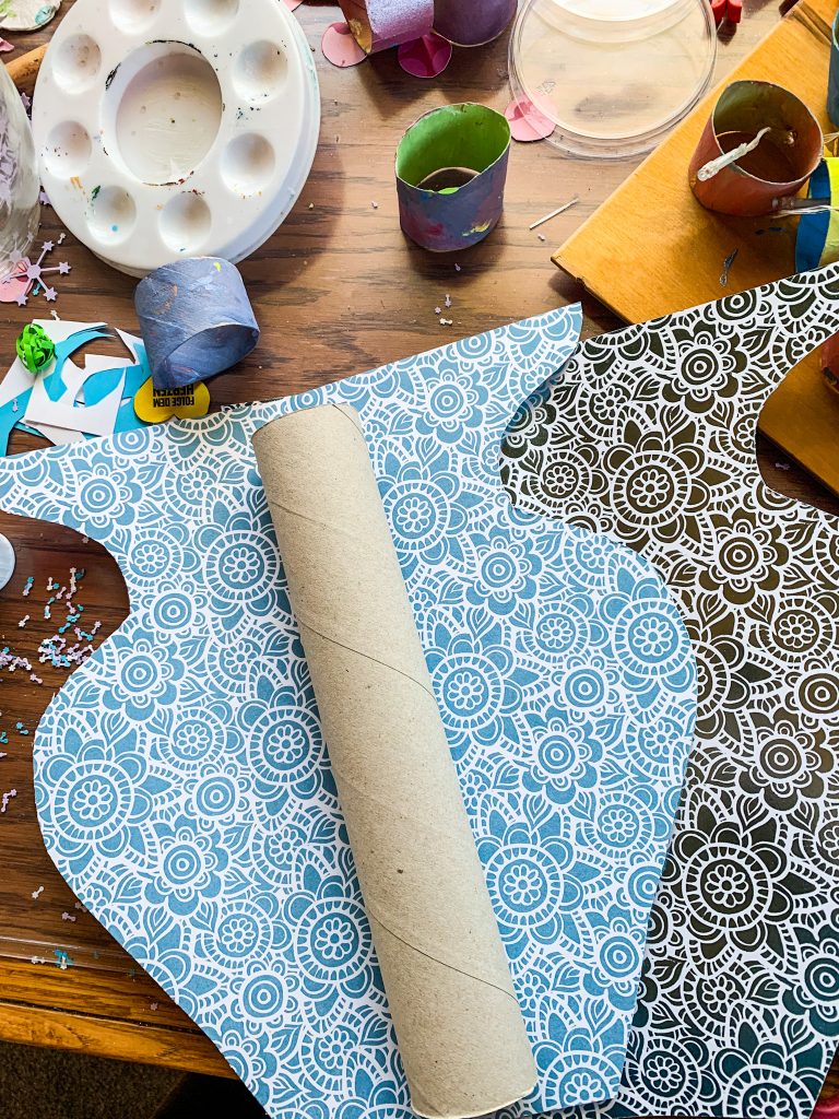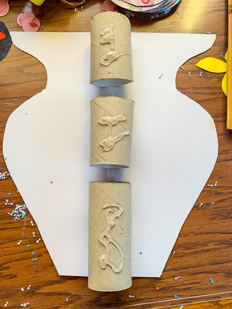 Danach die Küchenrolle nehmen, mehrfach durchschneiden (damit man die unterschiedlich langen Blumen/Stiele leichter arrangieren kann und nicht alles vertikal nach oben geht, wenn man die Küchenrolle ganz ließe.) und mit der Heißklebepistole anbringen.