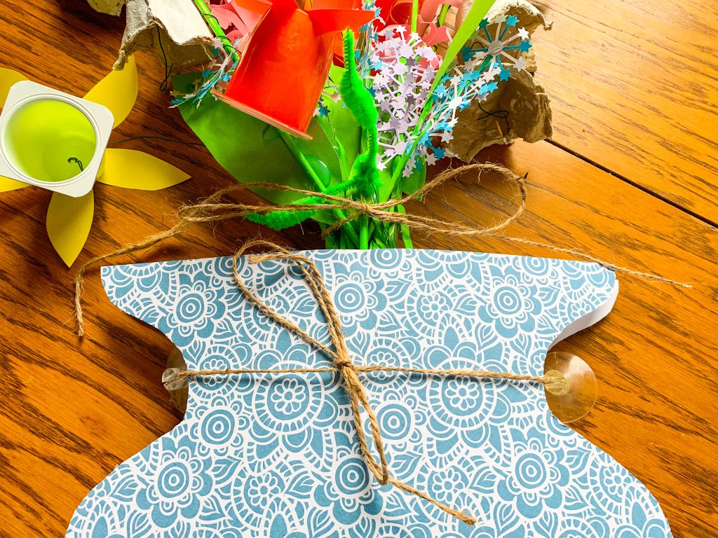 Hierfür einfach die Schnur um die Vase binden mit genügend Platz rechts und links mit den Saugnäpfen befestigen, Schleife machen, fertig. Dann kann man (gemeinsam mit Klebeband) die Vase am Fenster befestigen. Dies hält derzeit sehr gut.