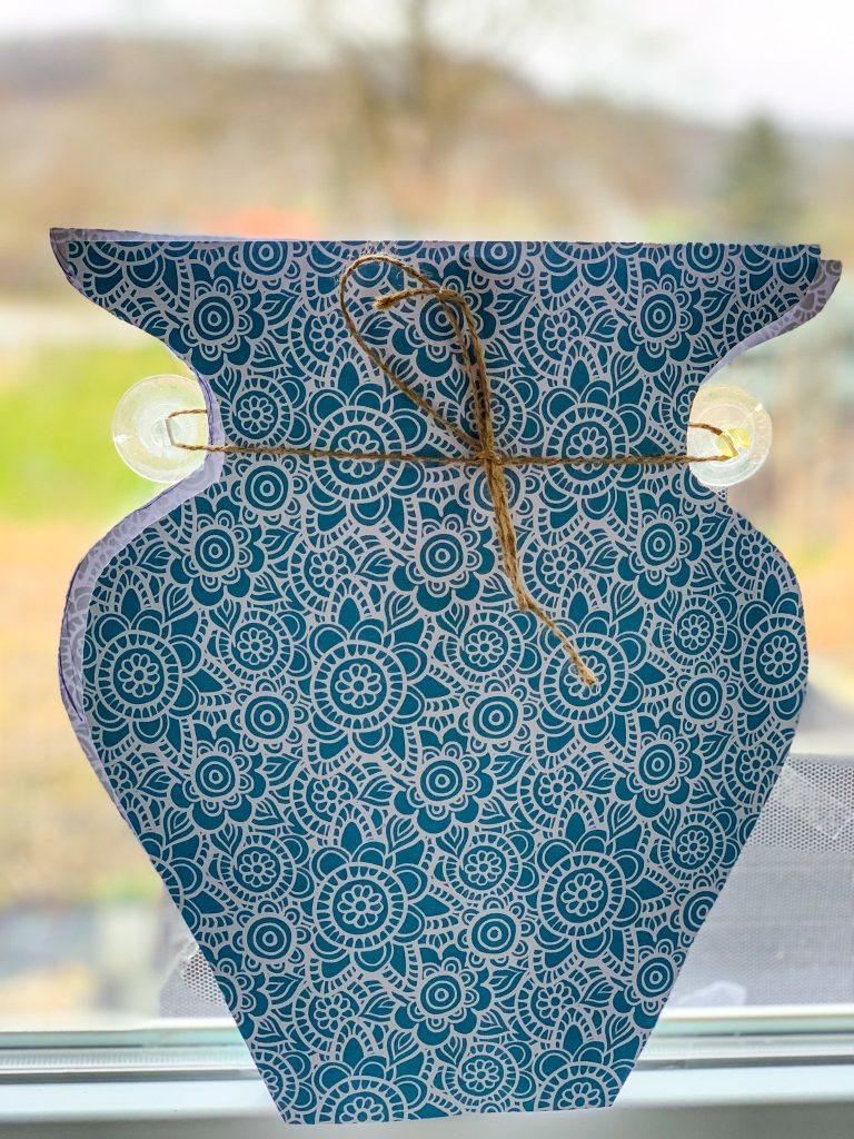 Wenn beide Seiten festgeklebt sind, kann man die Vase mit Klebestreifen an dem Fenster anbringen.