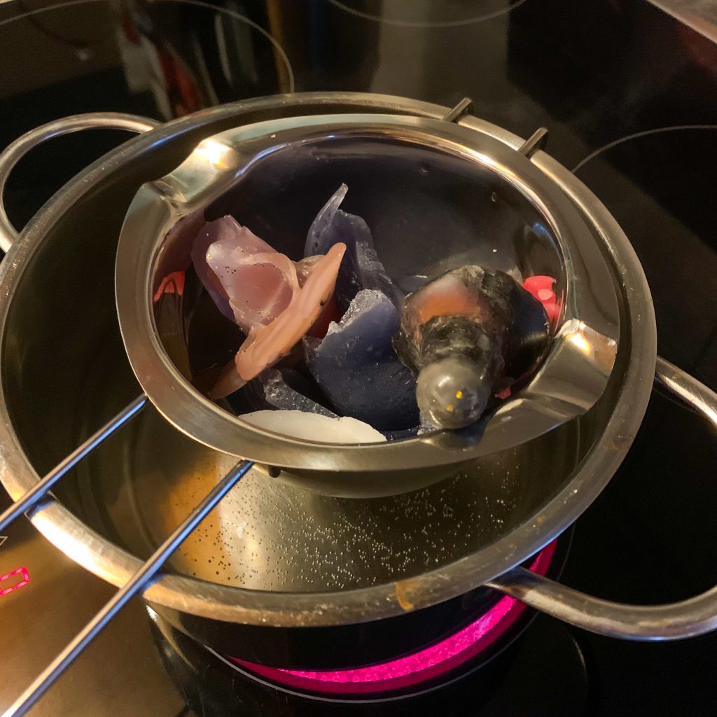 Zuerst setzt man das Wasser auf und befüllt den Schmelztopf mit den Kerzenresten. Dann bestückt man die Silikonformen mit je einem Docht und macht diese an den Dochthalter fest.