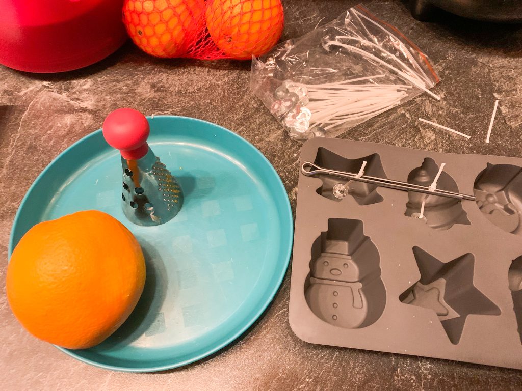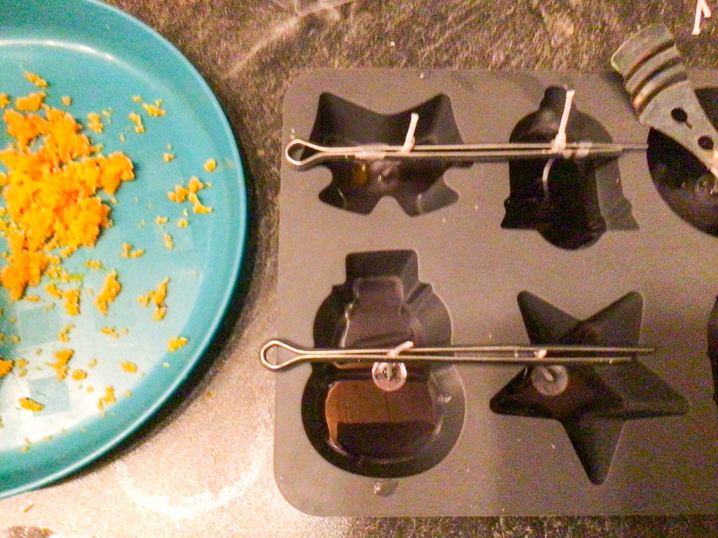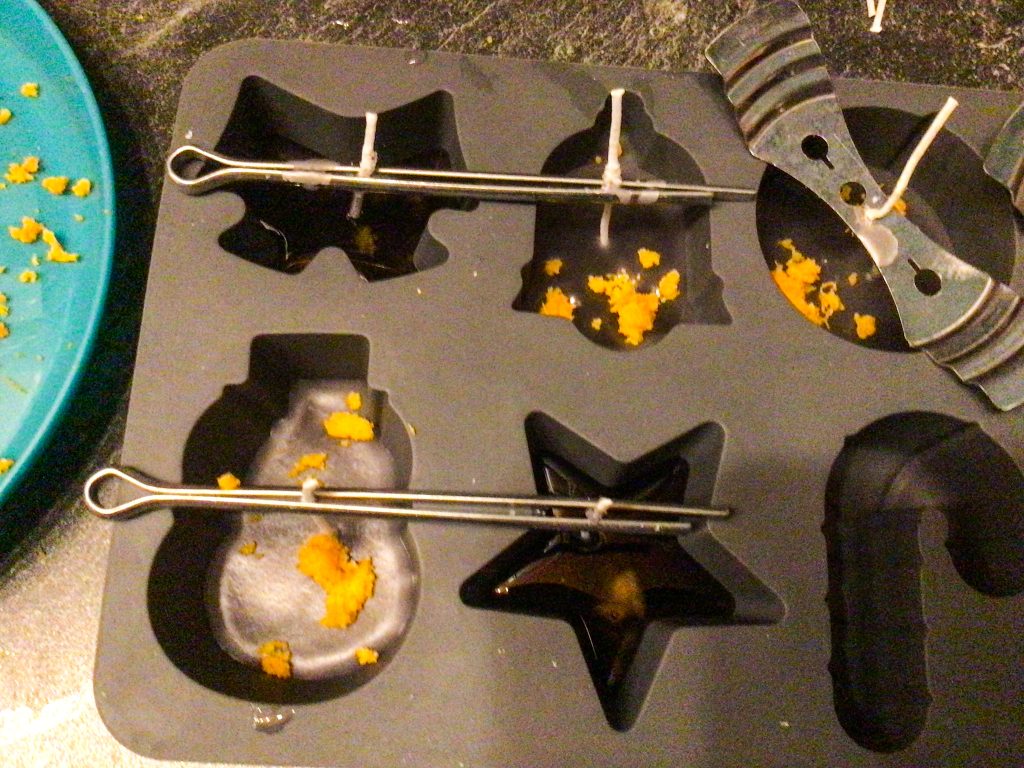 Nun heißt es warten. Währenddessen kann man die Orangenschale reiben. Wenn das Wachs geschmolzen ist, kann man damit anfangen die Silikonformen schrittweise zu füllen.