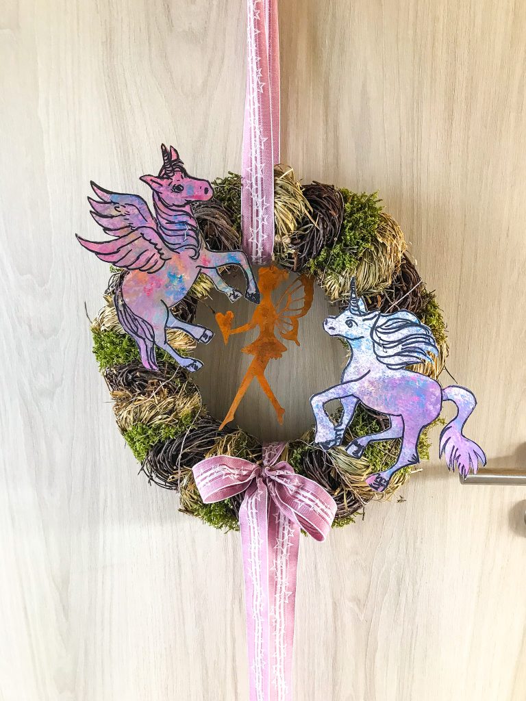 Im Anschluss, wenn alles trocken ist, schneidet man die Einhörner aus und bringt sie mit Draht an den Kranz, ebenso die Fee wie auch das Schleifenband.