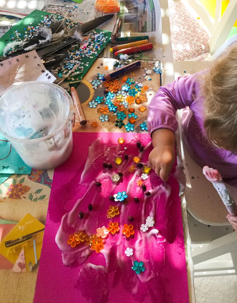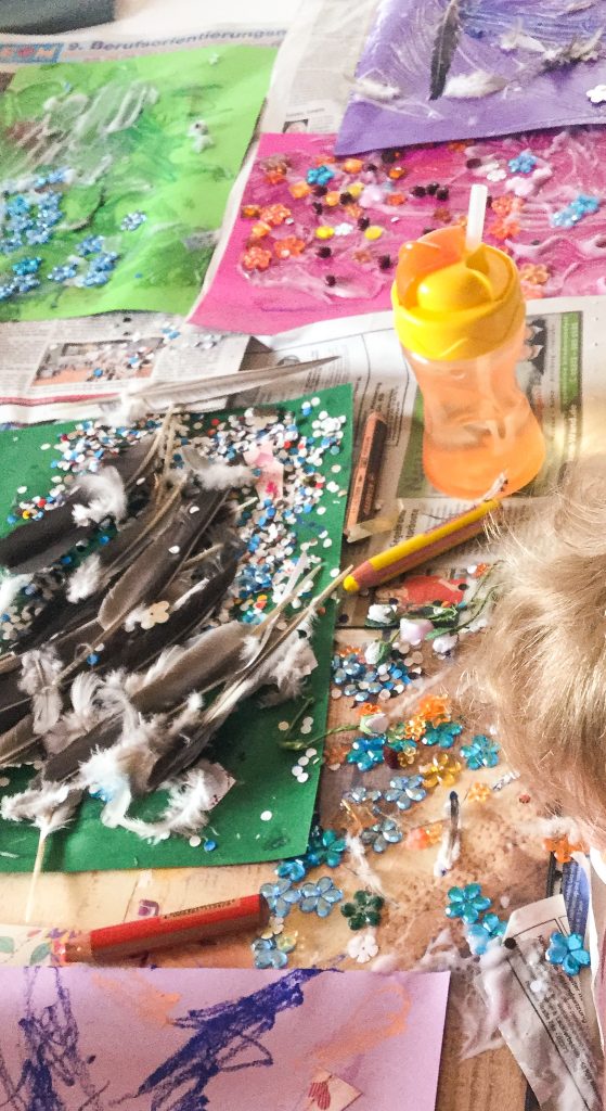 Sehr beliebt sind bei uns phasenweise Schnipsel- oder Klebebilder. Damit bezeichne ich all die Werke, wo man (oder ältere Kinder schon selbst) einfach nur Kleber oder Kleister (je nach Material, siehe unten) aufbringen muss und dann mit unterschiedlichsten Materialien munter drauflos geklebt werden kann. Es können Reste von anderen Bastelarbeiten oder Ausgestanztes sein (deswegen Schnipselbilder), Naturmaterialien, Streugut oder Sticker, Glitzer, einfach alles, was sich aufkleben lässt.